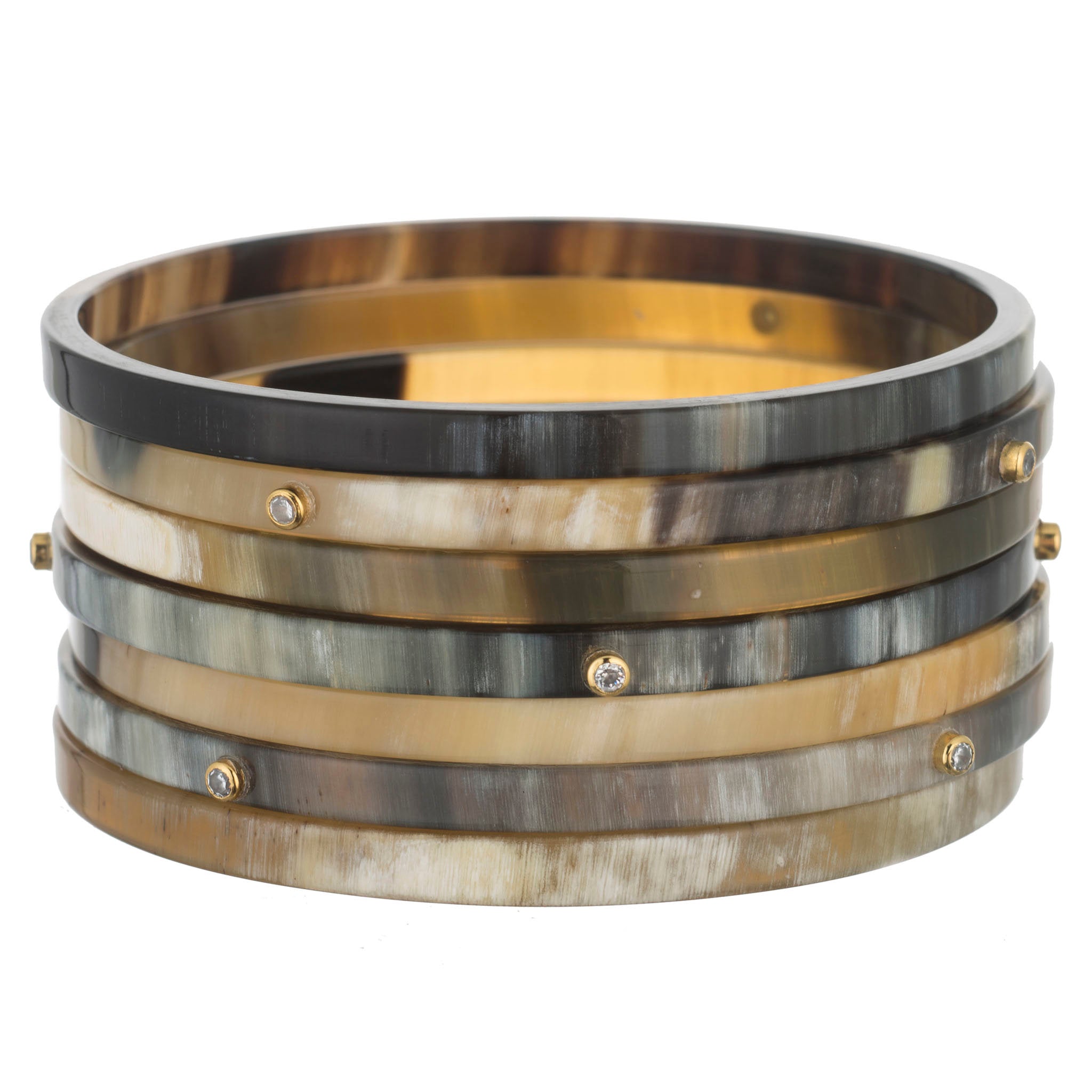 Set of 7 natural buffalo horn, flat edge bangles with CZ crystals. Buffalo horn is a natural material, each item has a unique character and may vary from image.