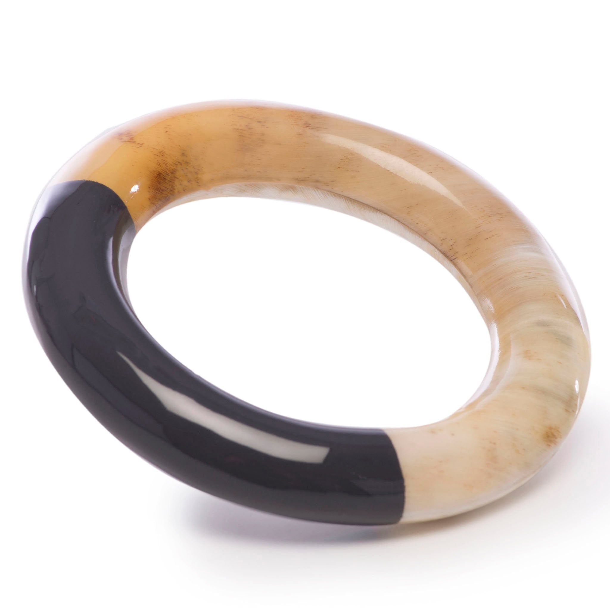 Natural horn hollow circle bangle with 1/3 charcoal lacquer. Buffalo horn is a natural material, each item has a unique character and may vary from image.