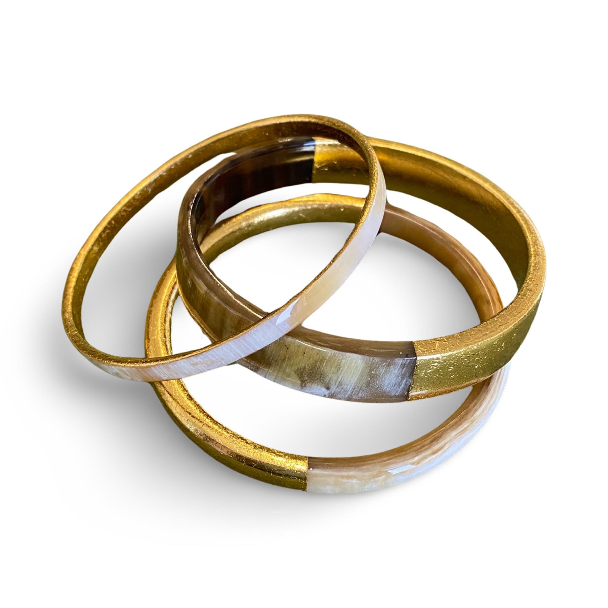 Set of 3 different-shaped horn bangles with gold lacquer accents. Buffalo horn is a natural material, each item has a unique character and may vary from image.