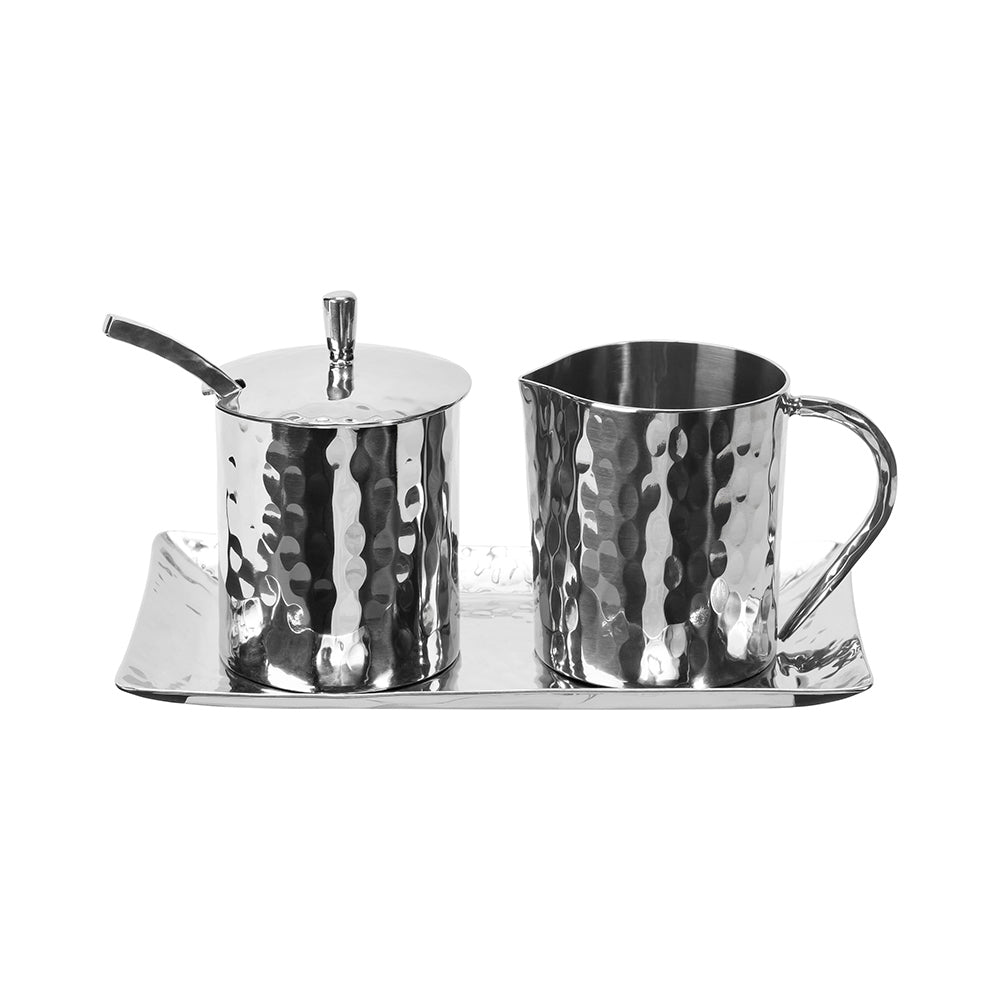 Add beauty and elegance to your daily dining with VIVO STUDIOS hand forged 18/10 hammered stainless steel cream, sugar on a rectangle tray, dishwasher safe.