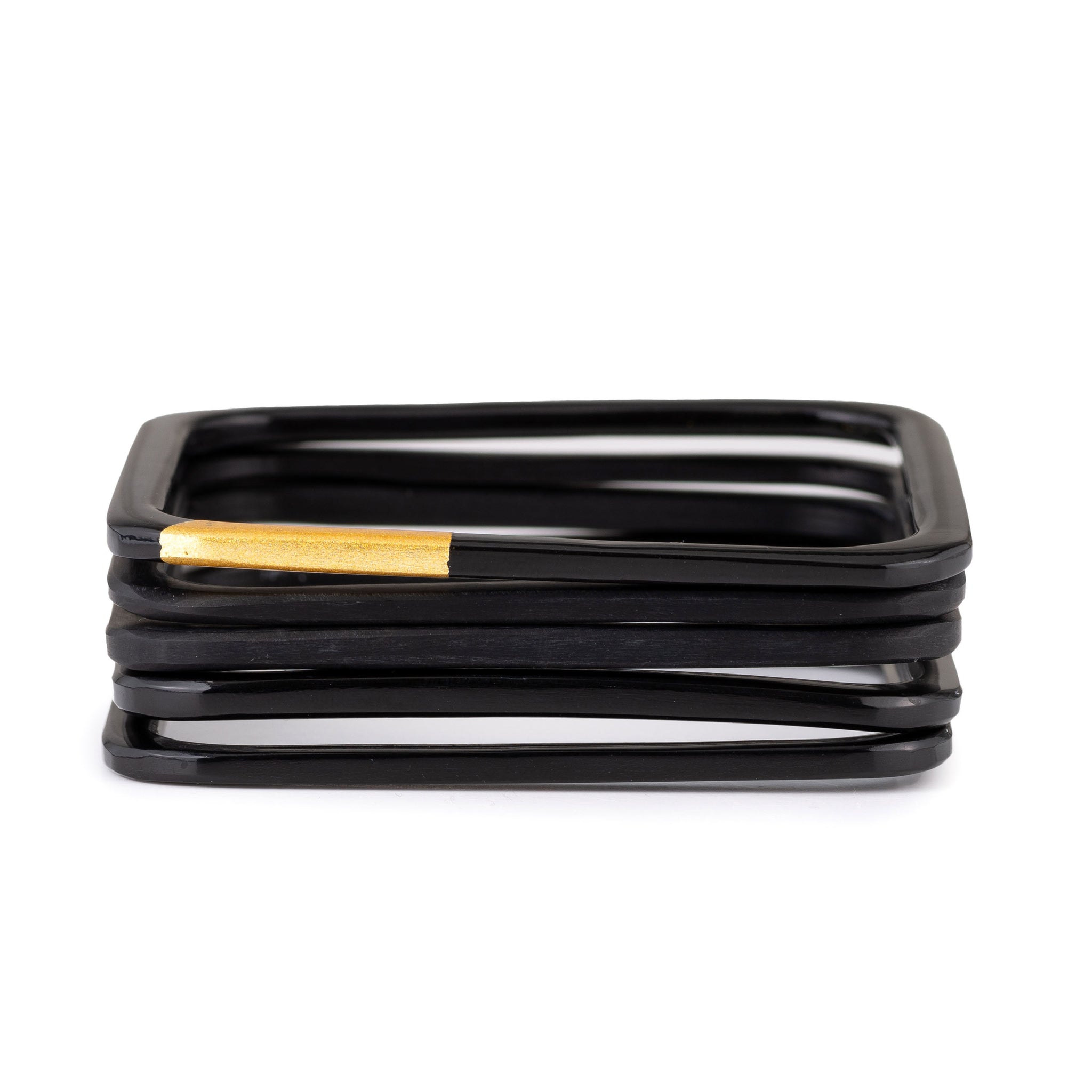 Square, black horn bangle set with gold lacquer accents. Buffalo horn is a natural material, each item has a unique character and may vary from image.