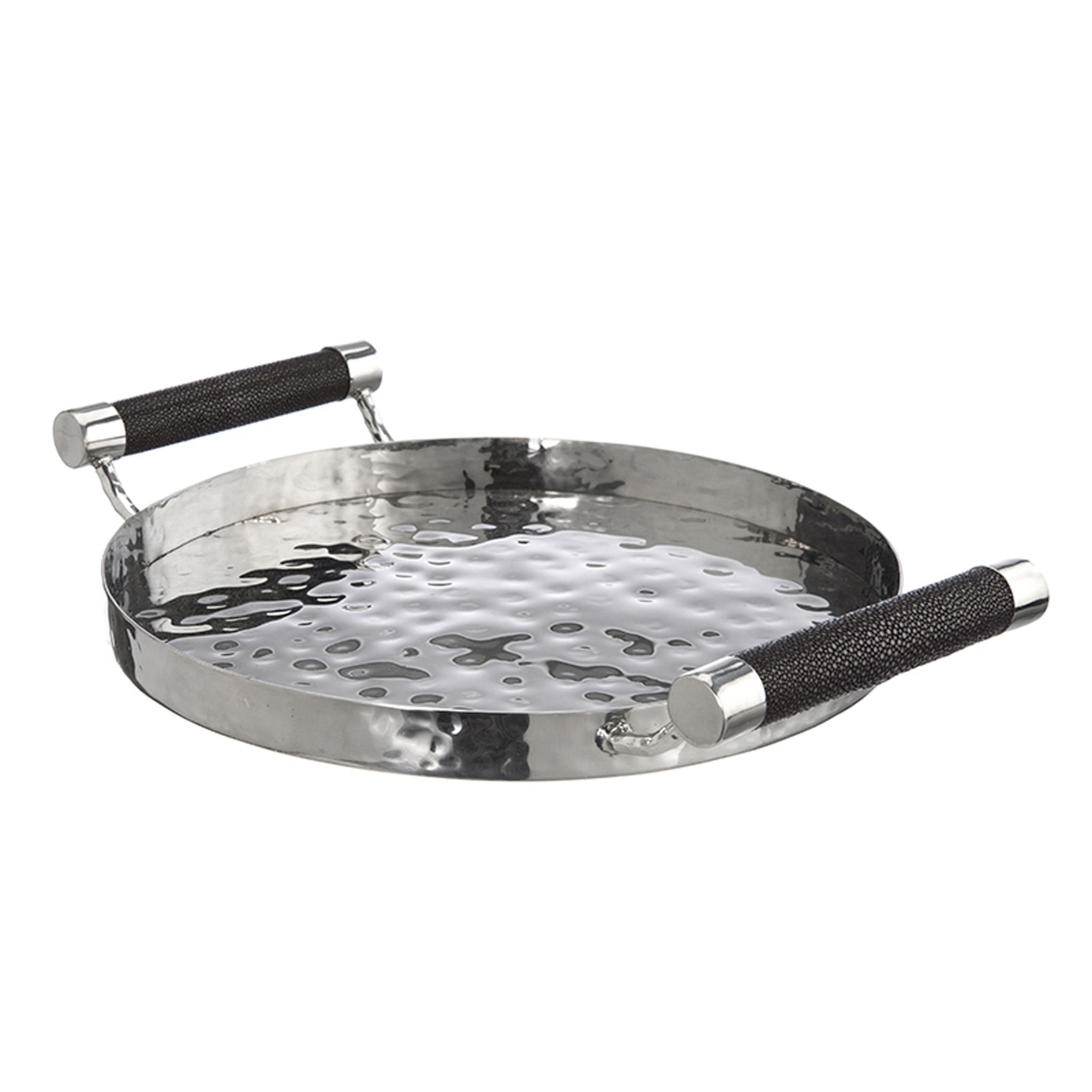 VIVO hand made, hammered stainless steel round tray. Custom genuine shagreen covered handles. 12 IN