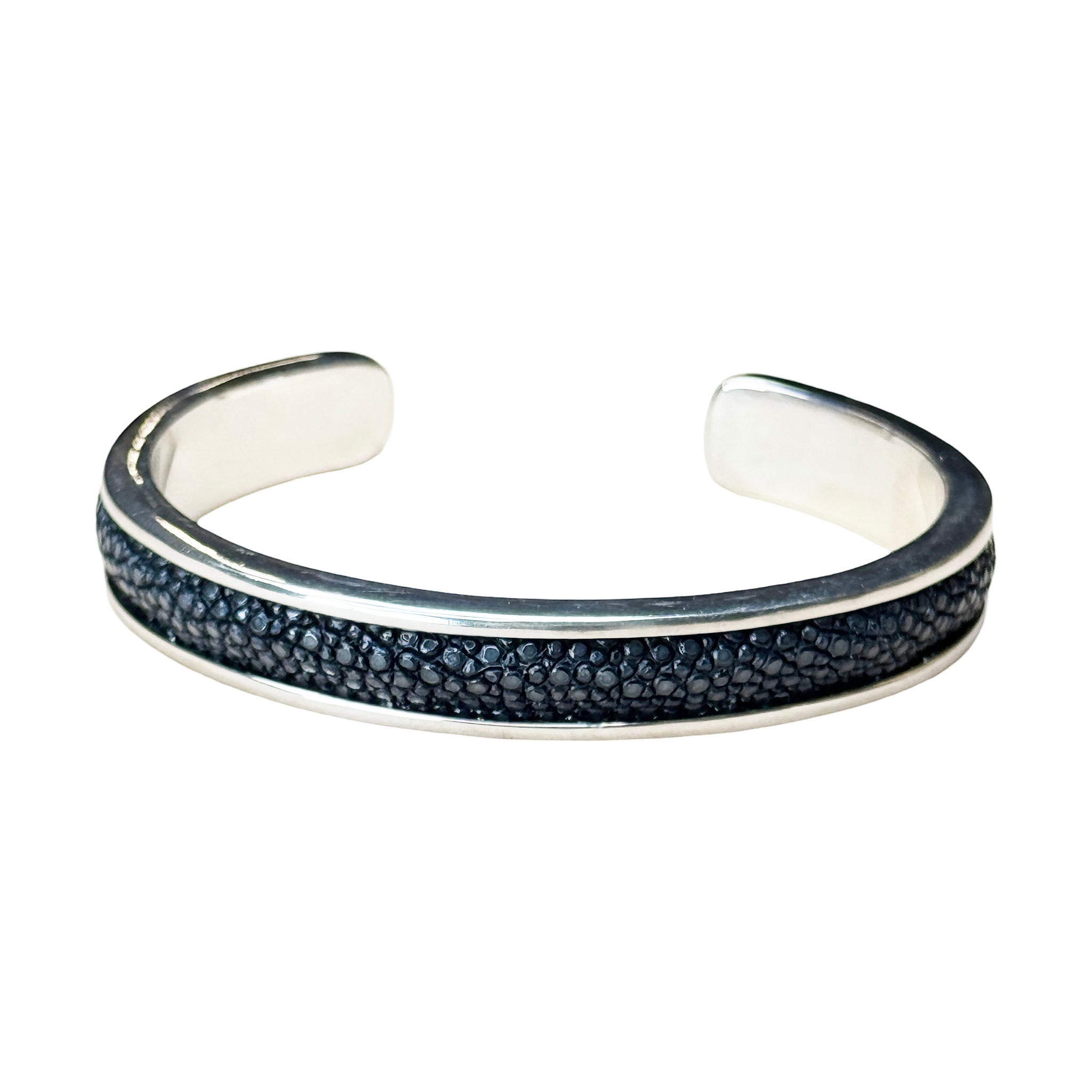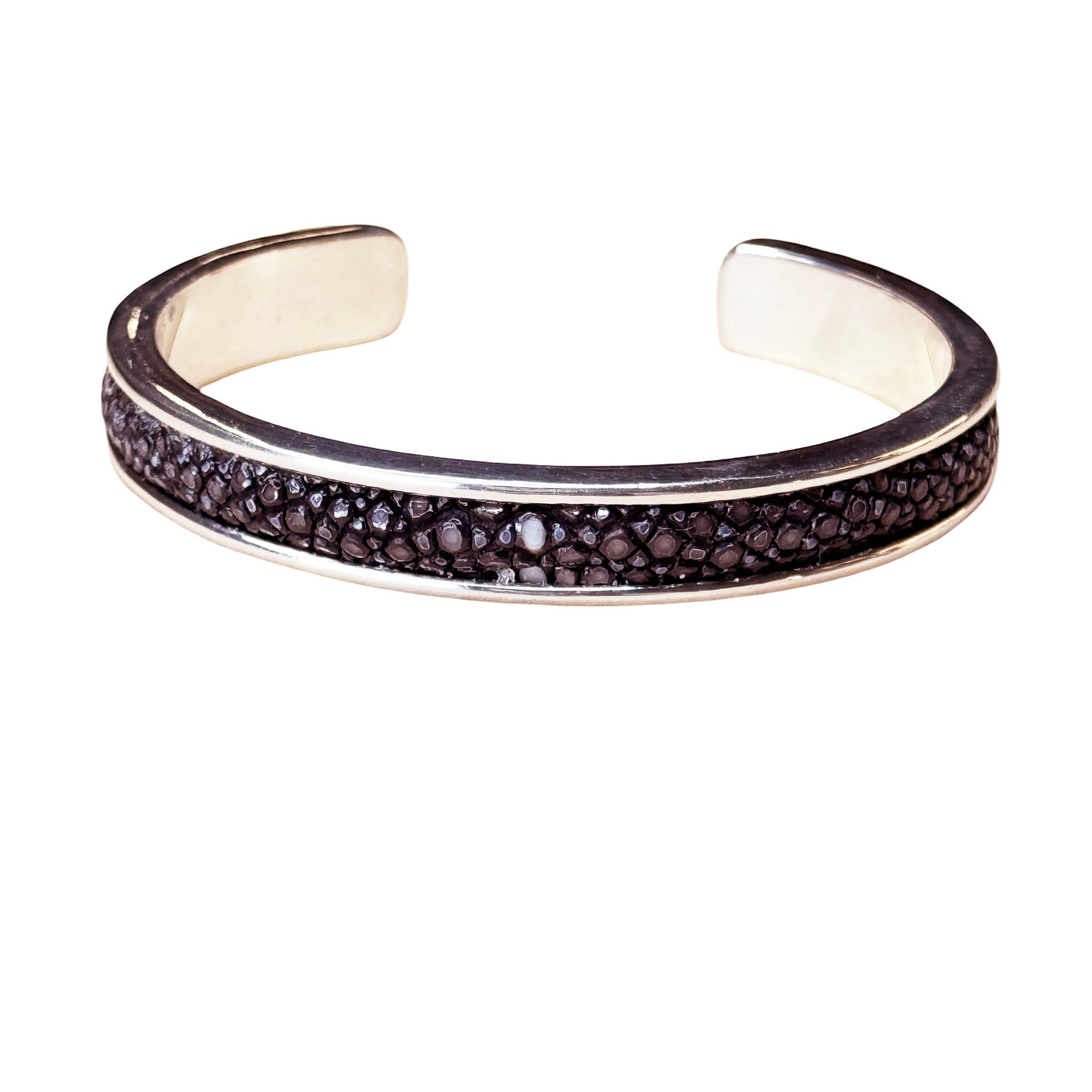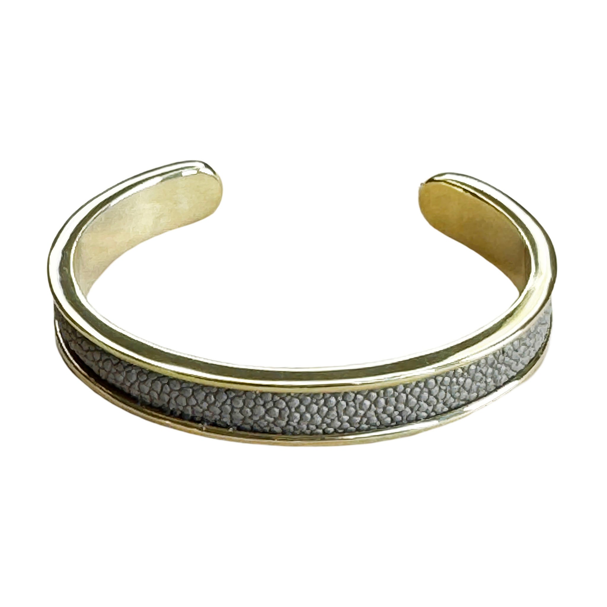 Slim is a narrow white gold plated cuff that can be shaped for a perfect fit. Genuine shagreen inlay is available in 13 colors. Great for stacking