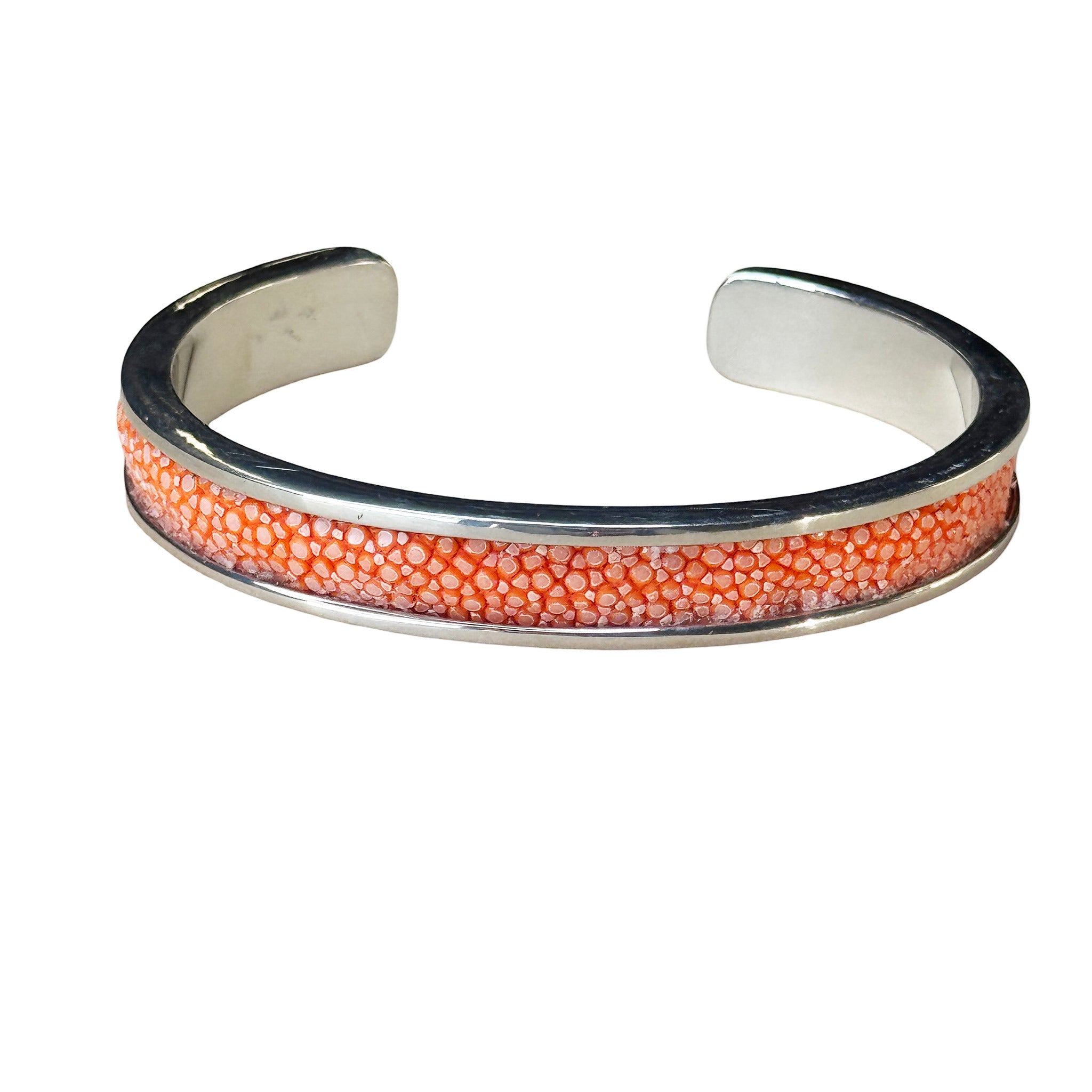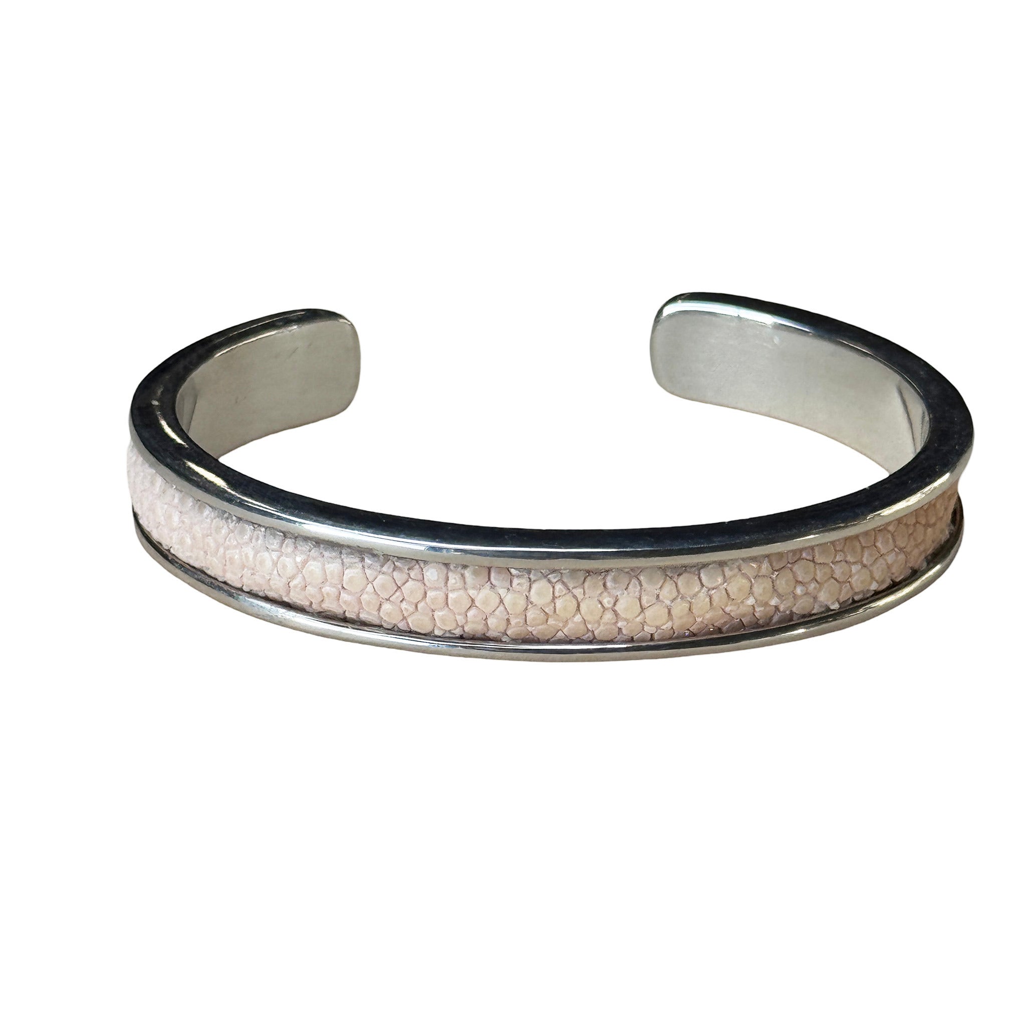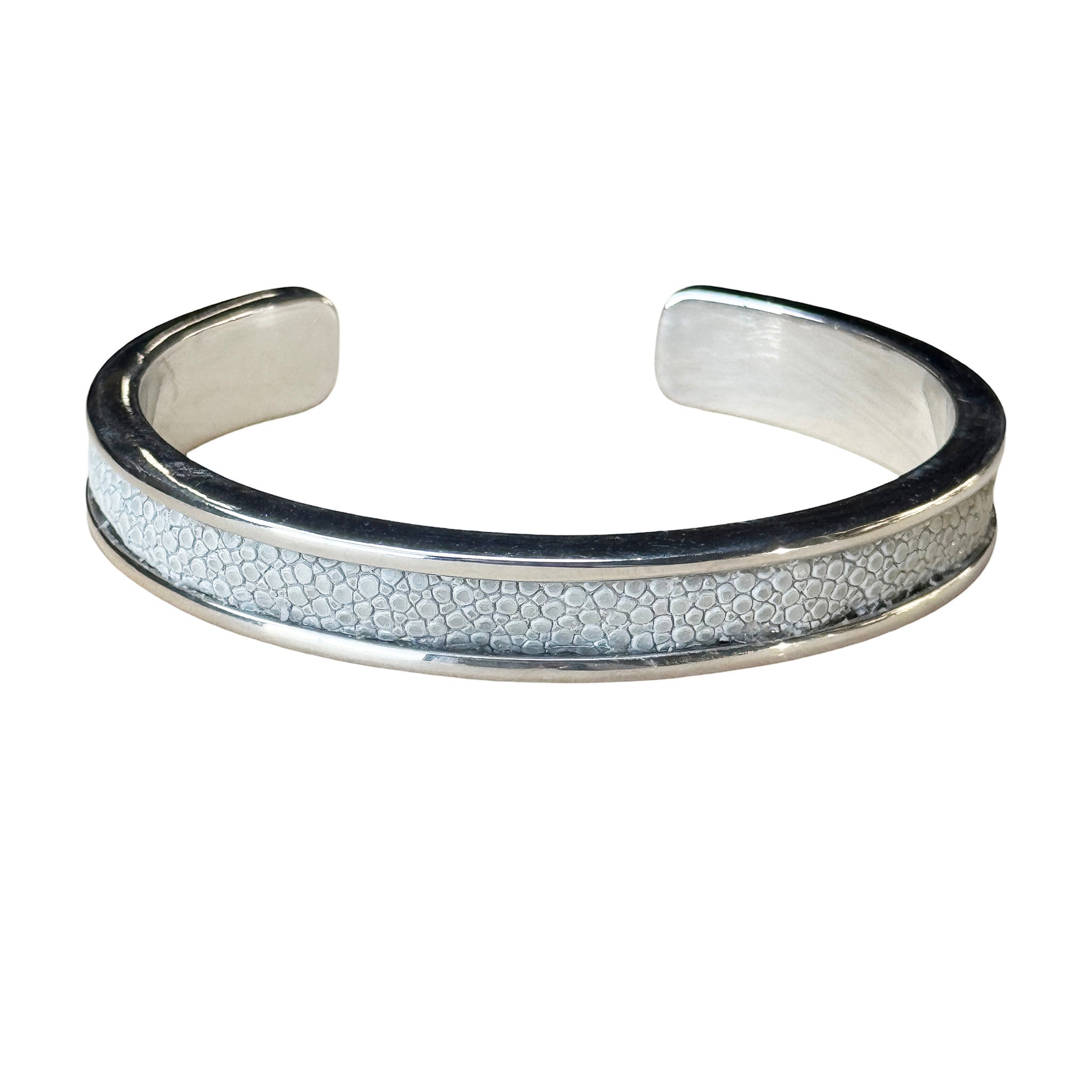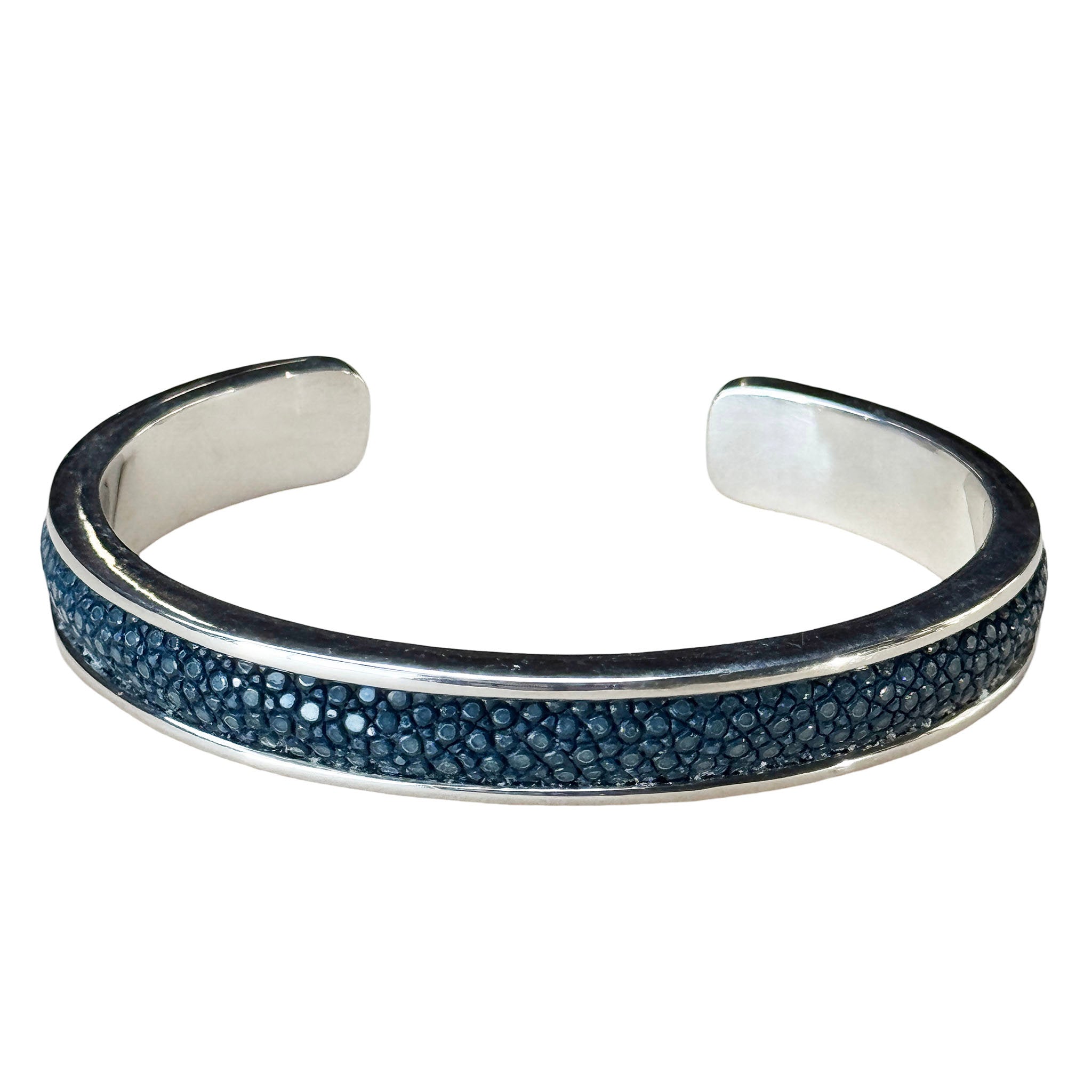 Slim is a narrow white gold plated cuff that can be shaped for a perfect fit. Genuine shagreen inlay is available in 13 colors. Great for stacking