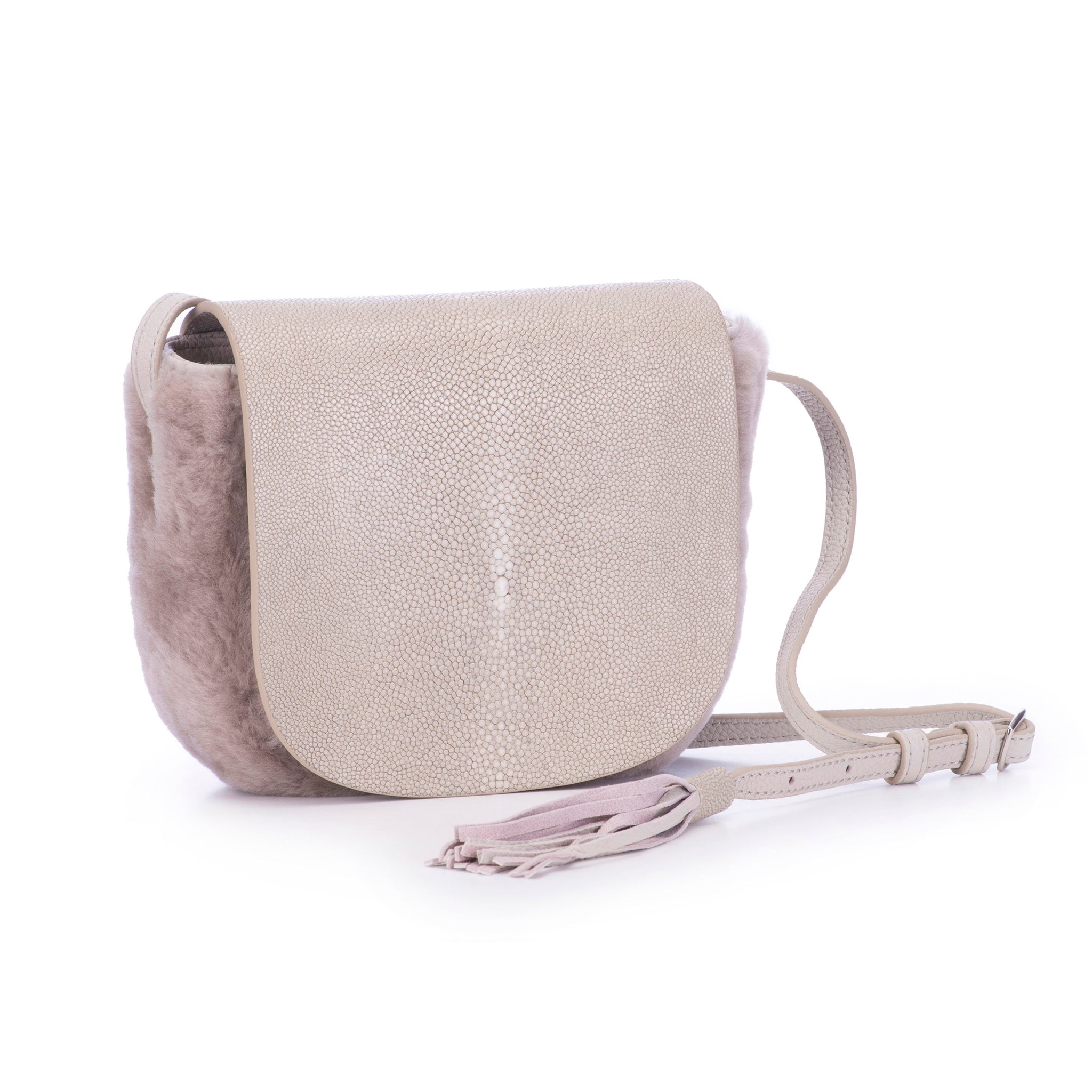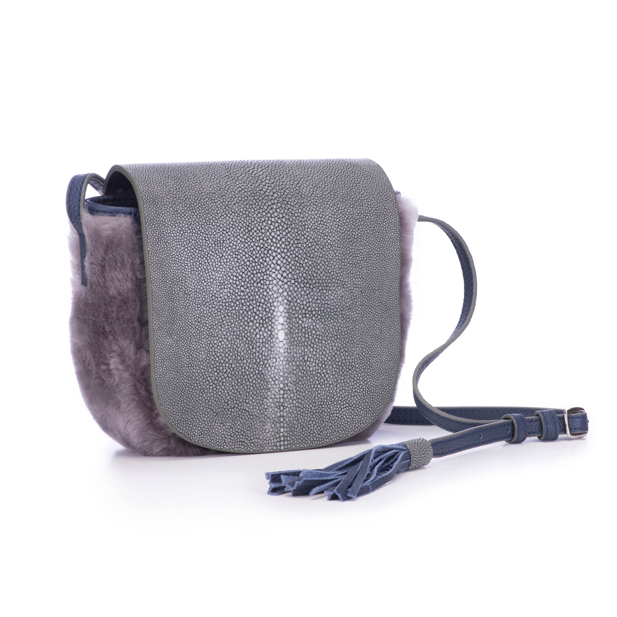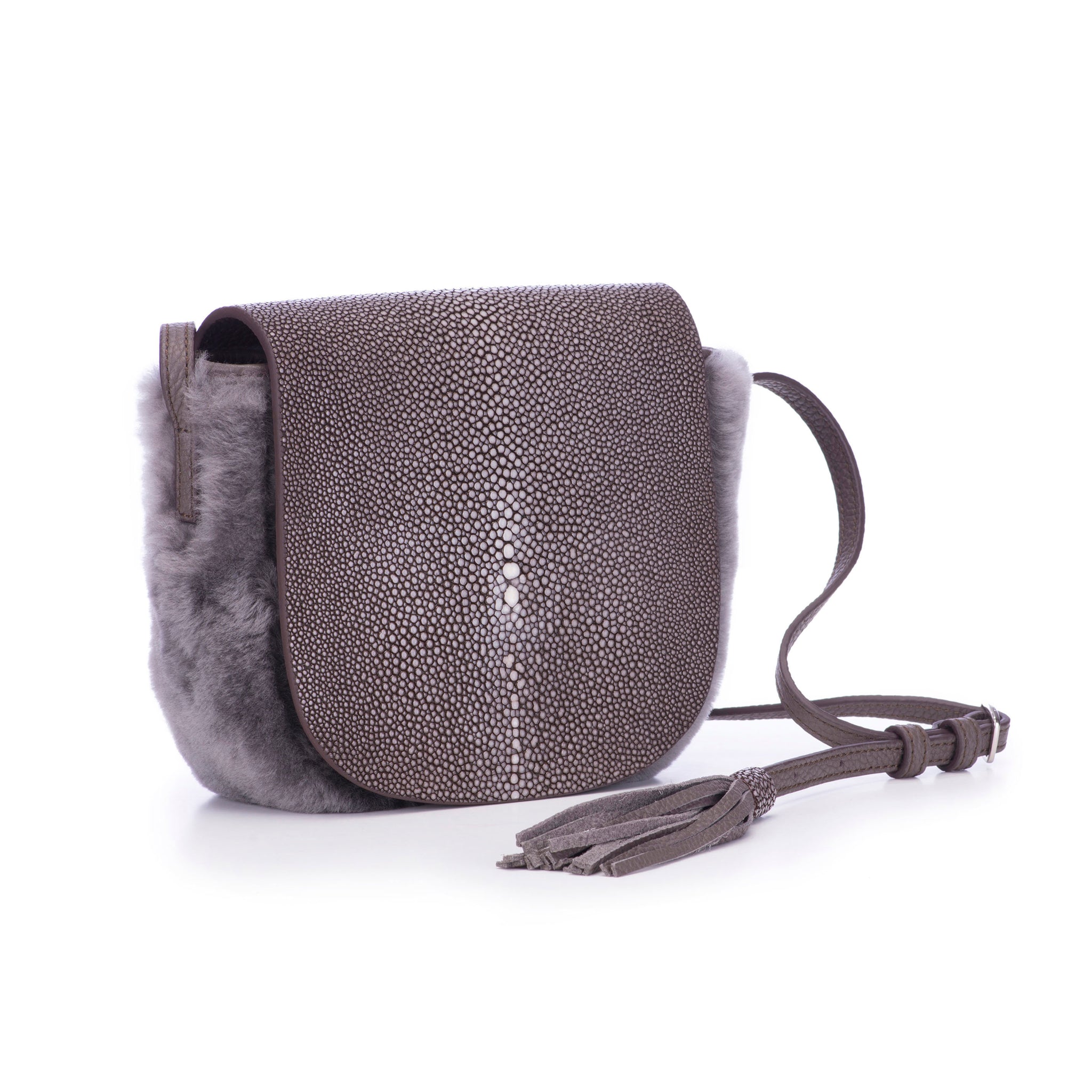 This fabulous and fun bag sits comfortably right by your side, making conversation and eluding to the joie de vivre. This bag is striking with a shagreen front flap. Its body is completed with your choice of textured leather or Spanish MeriNO shearling. The back slit pocket is perfect for quick stashing of anything from your phone to a pair of tickets for your evening planned out. Brooke has a range of colour options to adorn it, from neutrals to blues and greys. It comes with an adjustable cross-body leather strap that is finished with a flirty tassel. The inside is linen lined and has a side zipped pocket.Brooke measures 6" x 2" x &6.75"